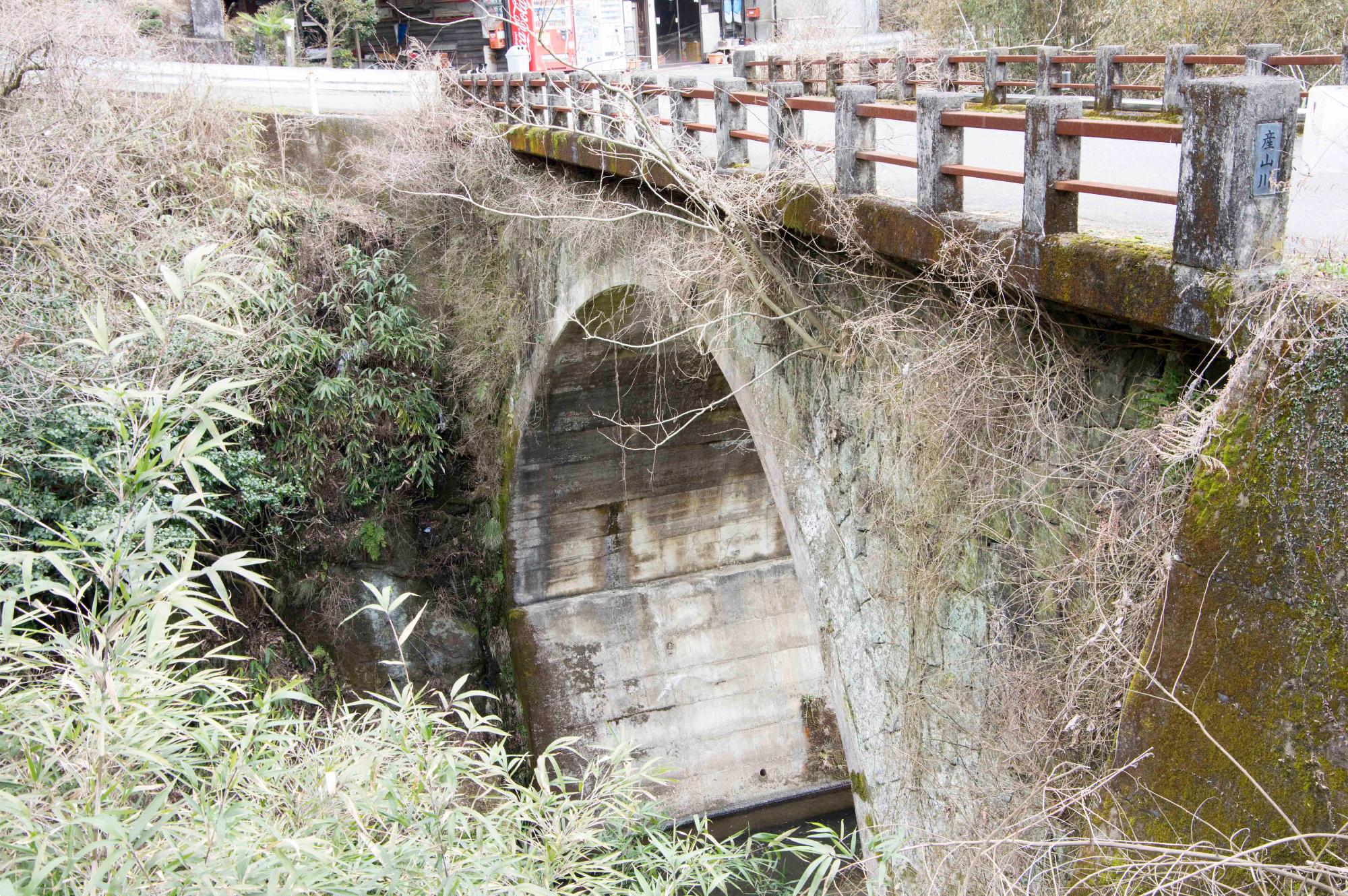 産山川に架かる単一の石造アーチ橋。曲尺場が取り残されており、鞘石垣の形跡など大正期の石橋の特徴的な構造が見られます。